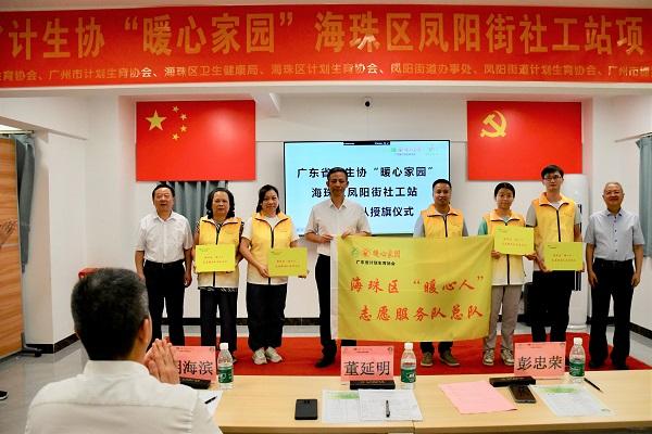 現(xiàn)場(chǎng),領(lǐng)導(dǎo)嘉賓為廣東省計(jì)生協(xié)“暖心家園”海珠區(qū)鳳陽(yáng)街項(xiàng)目點(diǎn)啟動(dòng)揭牌,同時(shí)為海珠區(qū)“暖心人”志愿服務(wù)隊(duì)總隊(duì)以及南洲、昌崗、鳳陽(yáng)、赤崗分隊(duì)授予隊(duì)旗。
