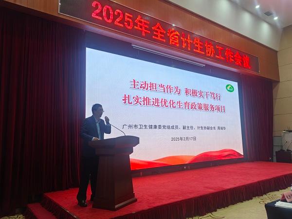 2月17日,2025年全省計生協(xié)工作會議在廣州召開,會議總結(jié)了2024年全省計生協(xié)工作情況,交流經(jīng)驗,對2025年工作進行安排部署。廣州市衛(wèi)生健康委黨組成員、副主任、市計生協(xié)副會長周端華以《主動擔當作為,積極實干篤行,扎實推進優(yōu)化生育政策服務項目》為題作經(jīng)驗交流發(fā)言。