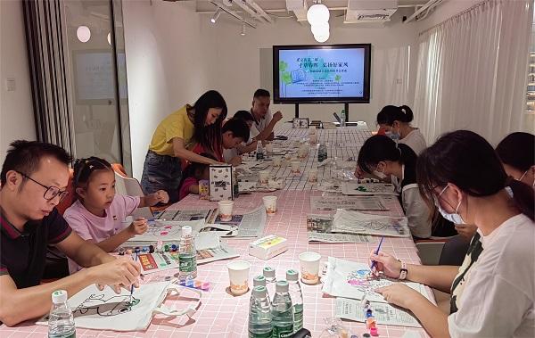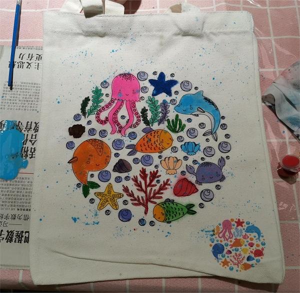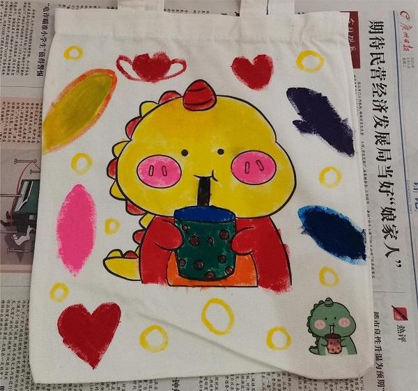 交流活動后,組織孩子們開展了DIY繪畫。工作人員精心準備了帆布袋、顏料、畫筆等器材物品,孩子們用畫筆描繪出屬于自己的顏色,將普通的帆布袋變成了一件件獨特的“工藝品”。