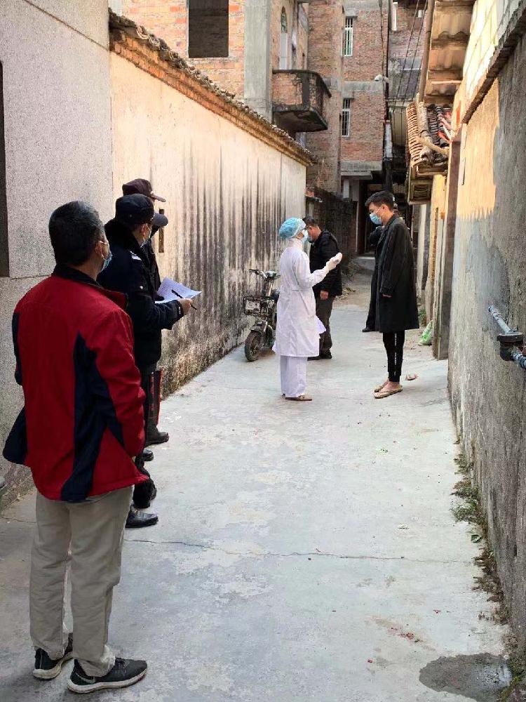 花都區(qū)花東鎮(zhèn)一線防疫人員走訪疫區(qū)來穗人員并對他們進行健康監(jiān)測。
