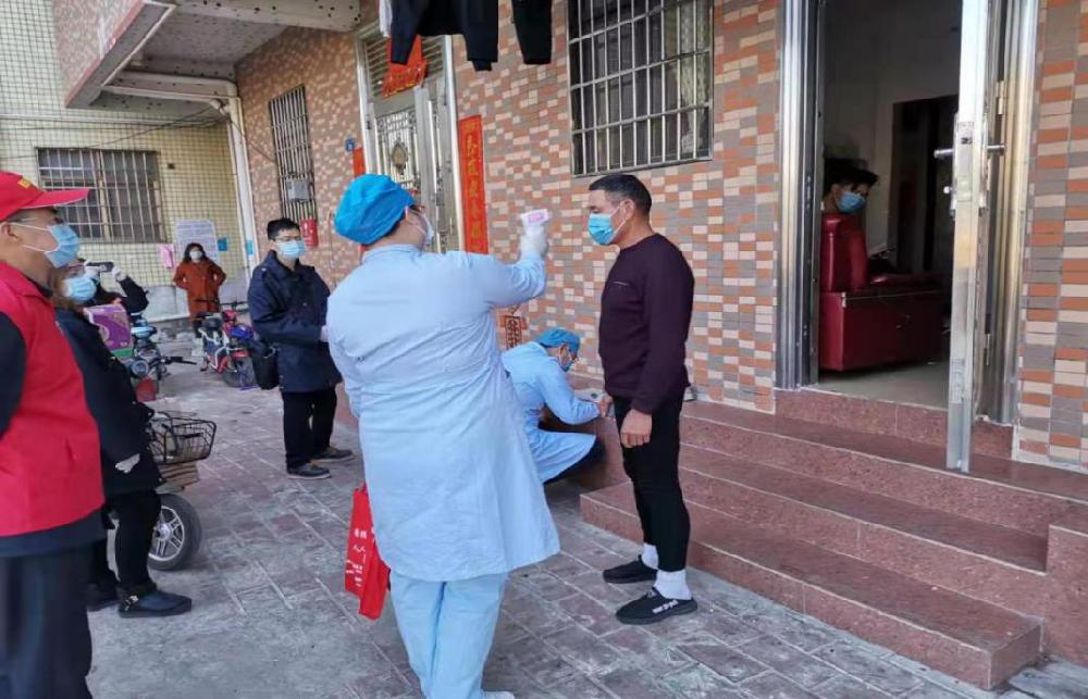 街道計(jì)生協(xié)聯(lián)合轄區(qū)社區(qū)衛(wèi)生服務(wù)中心工作人員為返穗人員測(cè)體溫,發(fā)放疫情防控宣傳單