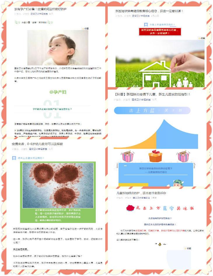 線上,借助建設(shè)衛(wèi)計幸福家園微信公眾號針對各類人群推出防疫知識科普,為了加大防疫知識宣傳力度,擴大受眾人群,還通過計生社工轉(zhuǎn)發(fā)至各居委街坊群,讓街坊們在家也可以了解防疫知識。