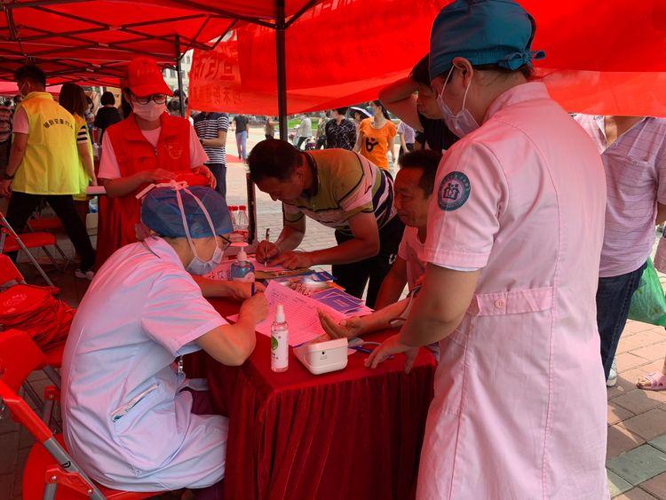 工作人員為前來咨詢的群眾免費(fèi)量血壓、測血糖。