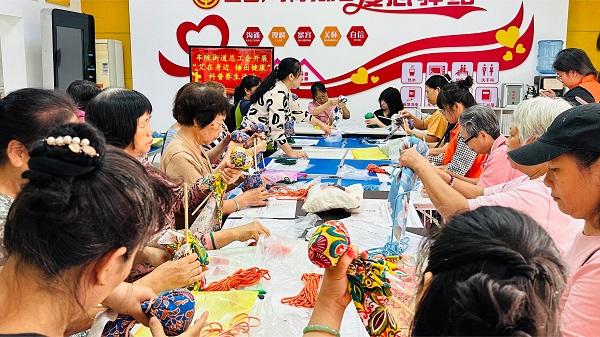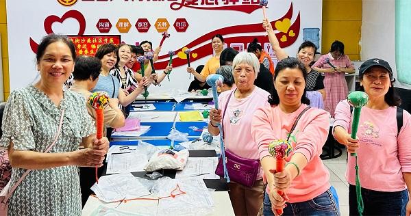 街道工會職工服務(wù)站內(nèi),指導(dǎo)老師圍繞艾草錘的特性和功效,詳細(xì)介紹艾草錘的使用范圍和適用癥狀,示范艾草錘的制作過程。針對腰酸背痛、溫散寒氣等老年常見癥狀,老師帶領(lǐng)大家一起用艾草錘做養(yǎng)生運動“拍八虛”,幫助大家增強自我免疫力,提升自身“戰(zhàn)斗力”。大家按照老師指導(dǎo),迫不及待拿起面前的材料包,興致勃勃地開始了艾草錘手工制作,鋪平布料,將艾草包放置布面三分之一處,支撐木棍插入艾草包,接著用粗布將艾草包裹成圓球,用麻繩將粗布和錘柄連接起來,然后繞著錘柄一直向下纏繞,一個藥香四溢形似話筒的養(yǎng)生錘做好了。制作過程中,大家互相分享經(jīng)驗、交流制作的心得和感悟,現(xiàn)場氣氛輕松活躍。