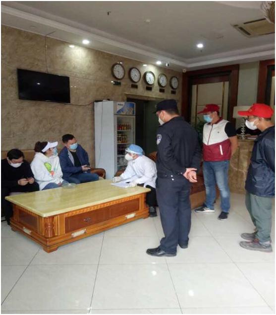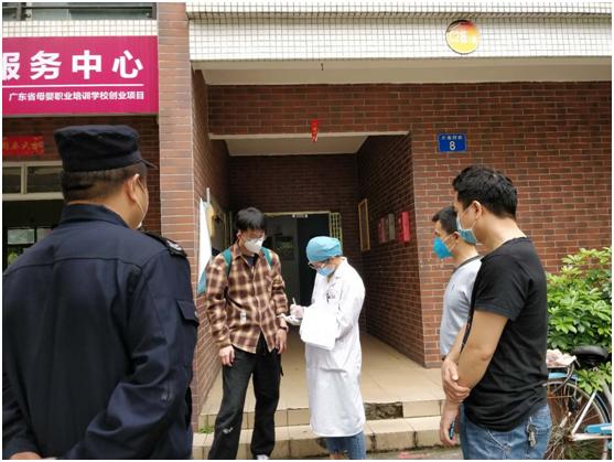 溫海鷹(右二戴紅色鴨舌帽)正在指導湖北籍返穗人員進行個人健康申報