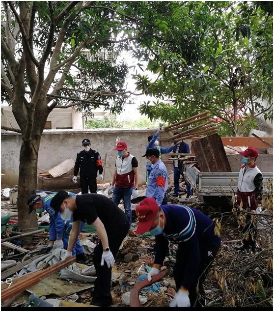 周偉禮(正中間戴紅色鴨舌帽)帶領社區(qū)男同事清理小區(qū)垃圾