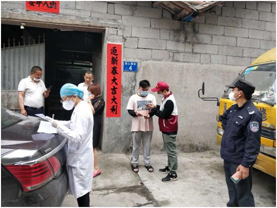 溫海鷹(右一)協(xié)同三人入戶小分隊為湖北返穗人員登記。