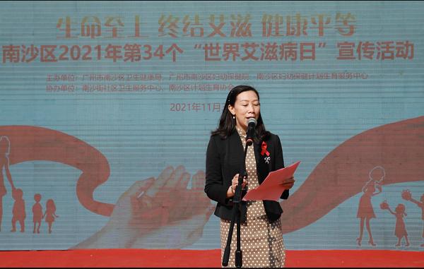 宣傳活動在優(yōu)美的音樂中拉開序幕,南沙區(qū)計生協(xié)秘書長楊文姬上臺致辭,她強調了艾滋病宣傳活動的重要意義,從既往的“預防”艾滋病,到現(xiàn)在提出的“消除”艾滋病,需要大家每一個人提高重視程度,做好防護措施,用實際行動遠離艾滋病,保護自己和身邊人的生命健康安全。