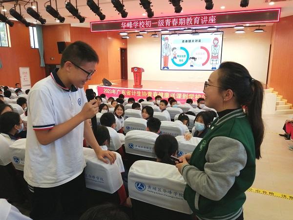 在現(xiàn)場(chǎng)問(wèn)答的互動(dòng)環(huán)節(jié)中,老師鼓勵(lì)大家克服羞澀,對(duì)講解中不懂的地方積極提問(wèn),并就如何正確對(duì)待青春期的生理特點(diǎn)與學(xué)生們展開(kāi)了討論,幫助大家緩解因青春期身體變化而產(chǎn)生的不適與焦慮。老師還引導(dǎo)學(xué)生們要正確看待男女生交往,在今后與同學(xué)的交往中遵循“以學(xué)業(yè)為主,交往有度”的原則。學(xué)生們也踴躍發(fā)言,表示日后與同學(xué)的相處中會(huì)保持言語(yǔ)行為有度。