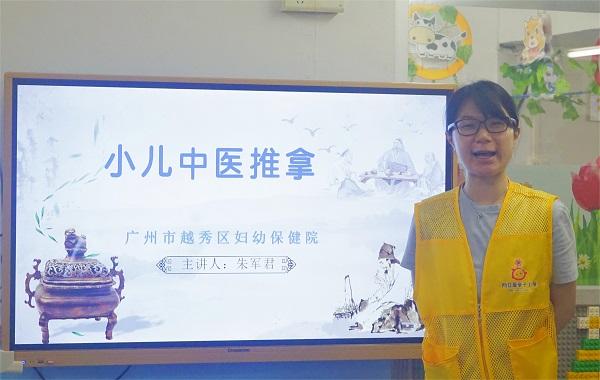 越秀區(qū)婦幼保健院的朱軍君醫(yī)生是擁有多年實(shí)踐經(jīng)驗(yàn)、擅長運(yùn)用中醫(yī)傳統(tǒng)療法進(jìn)行小兒康復(fù)治療的康復(fù)治療師?;顒又?,朱醫(yī)生圍繞運(yùn)用小兒推拿有效調(diào)理兒童腸胃功能、預(yù)防和治療感冒、促進(jìn)身高發(fā)育等方面展開詳細(xì)講解,現(xiàn)場演示了多個(gè)小兒常見癥狀推拿手法。家長和老師們表現(xiàn)出了極高的學(xué)習(xí)熱情,同步邊操作邊理解,使理論與實(shí)踐結(jié)合,現(xiàn)場洋溢著認(rèn)真活潑、專注和諧的氛圍。