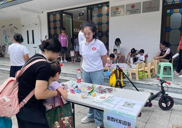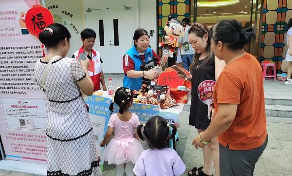 活動專區(qū)設置的“集市區(qū)”同樣熱鬧非凡。社區(qū)醫(yī)生健康咨詢攤位前,家長們踴躍咨詢嬰幼兒護理與營養(yǎng)膳食問題;越秀區(qū)衛(wèi)健局普惠托育園、向日葵親子小屋等機構則為家長提供了專業(yè)的早教指導。慈善義賣區(qū)更是愛心涌動,由親子家庭帶來的閑置玩具、繪本等物品吸引大家駐足選購,在互動中傳遞溫暖與善意。