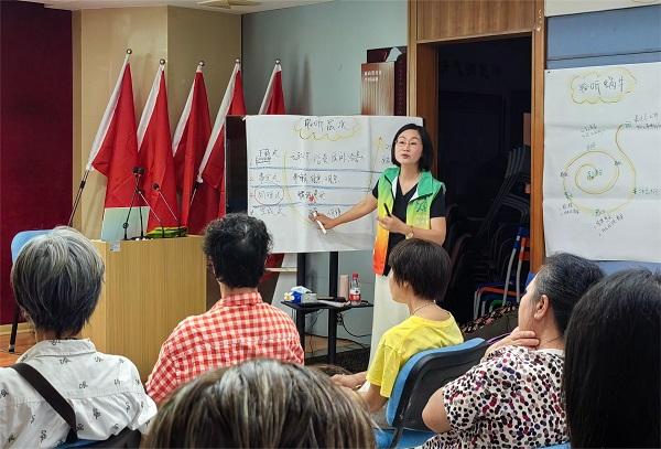 活動伊始,社工簡要介紹了“暖心家園”項目背景,強調(diào)了志愿服務(wù)隊伍的重要性,明確了社區(qū)志愿服務(wù)工作。隨后,越秀區(qū)暖心志愿隊培訓(xùn)講師馬玲老師為志愿者開展了《如何通過聆聽更好地支持他人》主題培訓(xùn),通過情景劇、演練等工作方式,介紹聆聽的層次,以及學(xué)習(xí)聆聽的技巧,提升志愿者支持他人的能力。