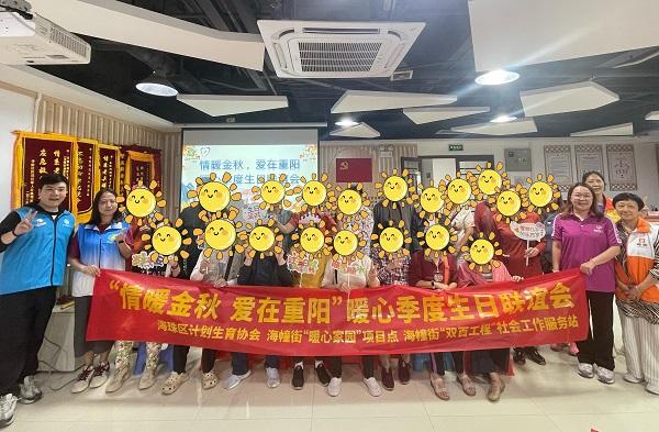 歲歲重陽,敬老情長。在重陽佳節(jié)來臨之際,為深入落實計生關(guān)懷政策,讓計生特殊家庭長者感受社區(qū)溫暖,10月27日下午,海珠區(qū)計生協(xié)聯(lián)合海幢街“雙百工程”社工服務(wù)站在“暖心家園”舉辦了“情暖金秋,愛在重陽”重陽敬老活動暨季度生日聯(lián)誼會,20多名計生特殊家庭長者歡聚一堂,共度溫馨午后。