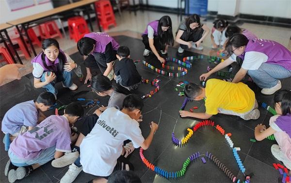 隨著暑期夏令營活動的深入,孩子們進入了自我探索與團隊合作并進的階段。在“我是哪種小動物”自畫像環(huán)節(jié)中,孩子們用稚嫩的畫筆描繪出自己的內心世界,通過優(yōu)勢視角發(fā)掘自己的獨特創(chuàng)新,自信心得到了顯著提升。而多米諾骨牌游戲則考驗了孩子們的耐心、協(xié)作能力和抗逆力,每當骨牌成功倒下時,孩子們的臉上都洋溢著成功的喜悅和團隊合作的自豪。在孩子和志愿者們的共同努力下,成功完成了“赤”字,以赤誠之心,展望未來。